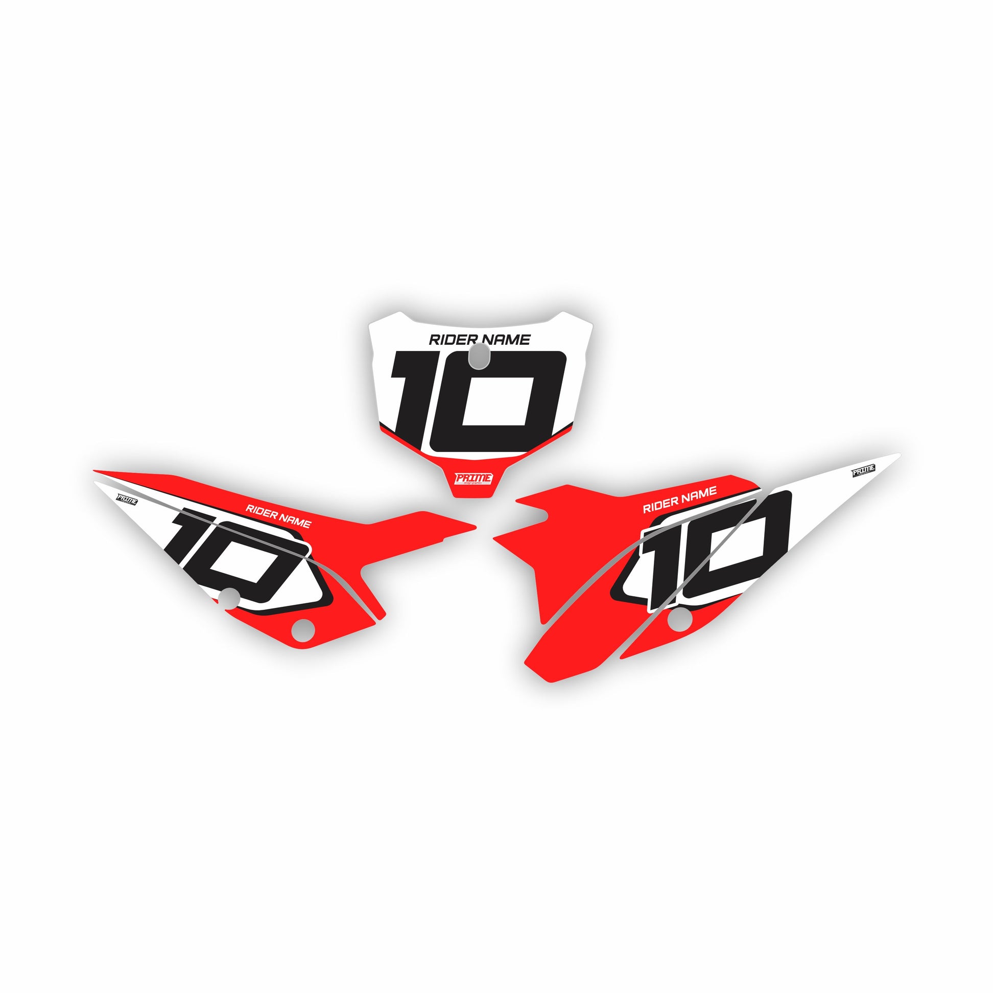 Here at Prime Design Graphics, our race number are pre designed so that we can drop your name and number into the design super fast, getting your order out to you as fast as possible. Our Race numbers include graphics for the front number plate / headlight & the side number plates / airbox covers.