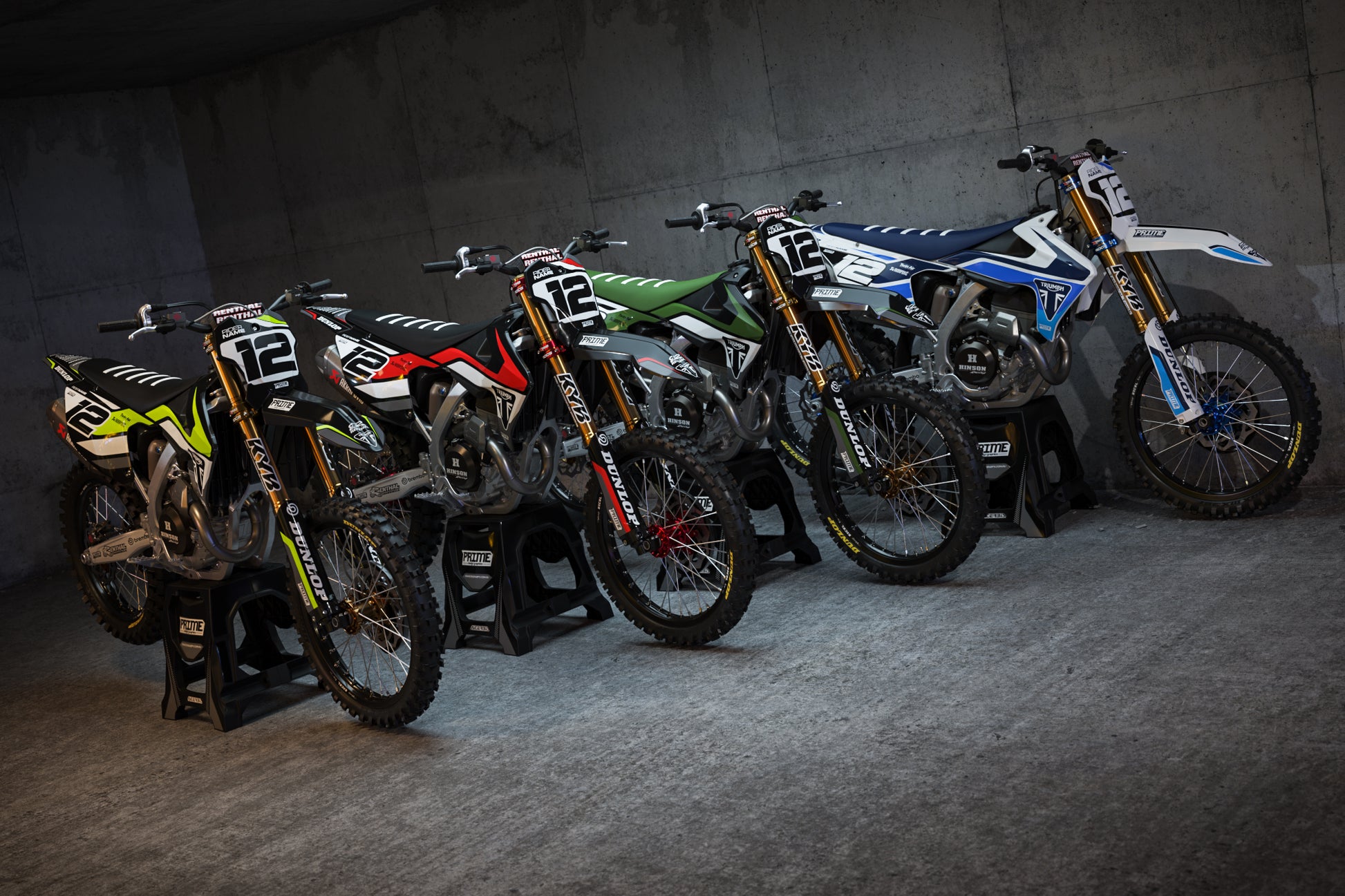 Here at Prime Design Graphics, our full kits are pre designed so that we can drop your name and number into the design super fast, getting your order out to you as fast as possible. Our Full Graphics Kits include graphics for the tank shrouds / radiators, rear guard, front guard, fork guards, swingarms, front number plate / headlight & the side number plates / airbox covers.