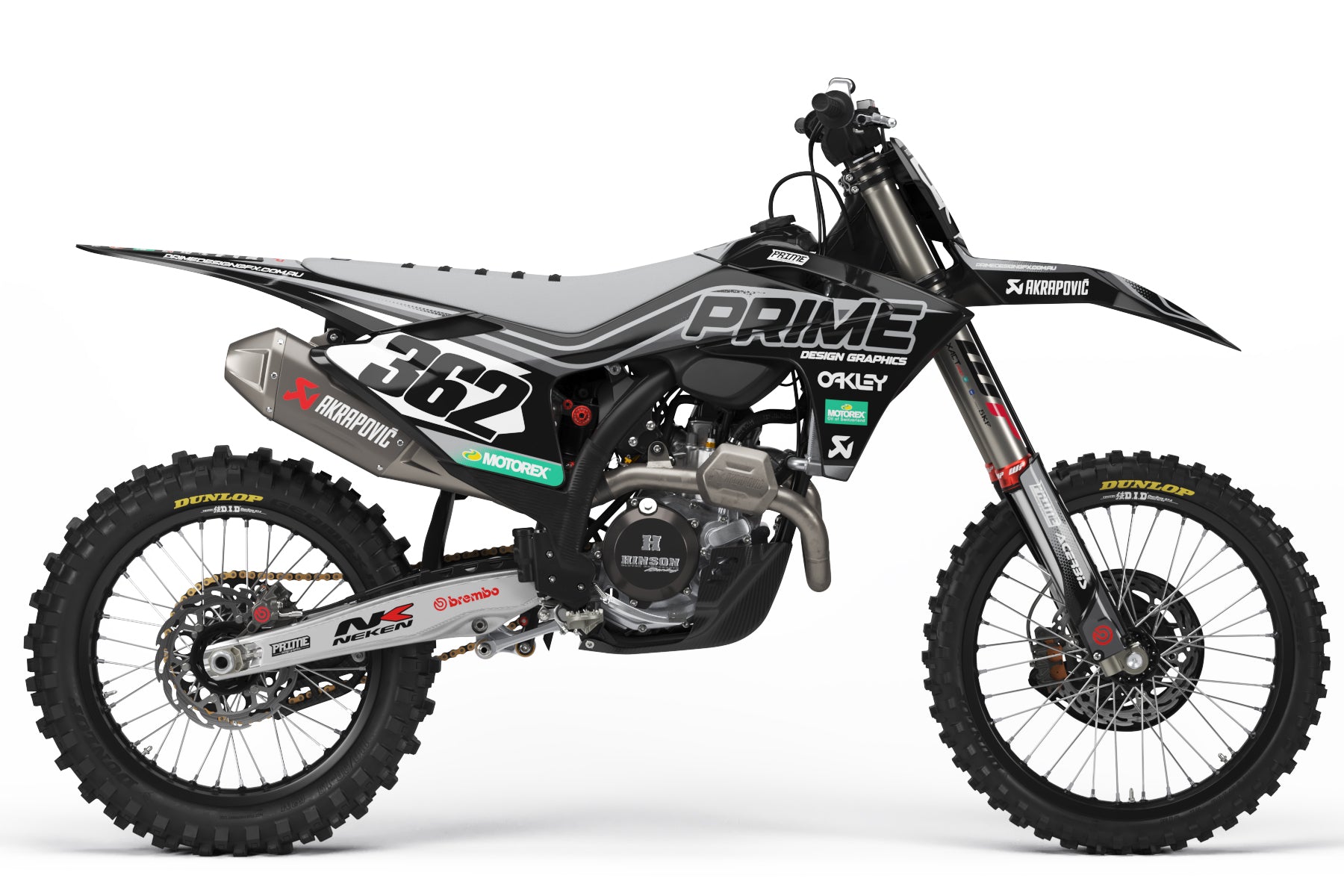 Here at Prime Design Graphics, our full kits are pre designed so that we can drop your name and number into the design super fast, getting your order out to you as fast as possible. Our Full Graphics Kits include graphics for the tank shrouds / radiators, rear guard, front guard, fork guards, swingarms, front number plate / headlight & the side number plates / airbox covers.